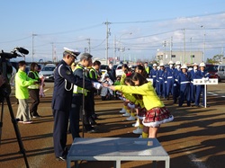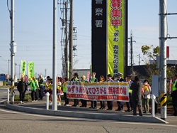 射水警察署と射水市、当協会は、4月6日(月)午前7時から射水警察署において、春の全国交通安全運動の出発式を開催し、交通事故の絶無を期しました。「一日警察署長」に射水市出身の競輪選手下条未悠さんが委嘱され、交通安全ゆるキャラ隊「ムズムズくん」「アラマちゃん」、射水交通安全大使「IM Zip」とともに、警察署前交差点で人波作戦を実施して、通行車両に交通安全を呼び掛けました。