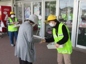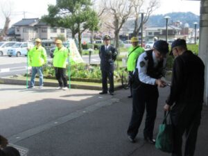4月9日(木)午前10時から、朝日町のショッピングセンター「アスカ」前において、黒東交通安全協会や交通安全関係団体約20名が集まり、ショッピングセンターを訪れた買い物客等に、春の全国交通安全運動のチラシと交通安全の願いのウェットティッシュを配布し、飲酒運転防止を呼びかけました。