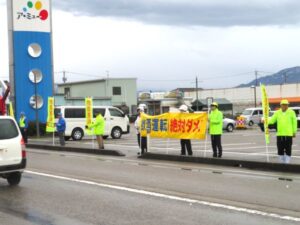 4月10日(金)、南砺市交通安全協会安全運転管理者部会(谷口幸大部会長)、南砺市地域交通安全推進部会(竹谷弘之部会長)は、春の全国交通安全運動期間中の「飲酒運転根絶の日」に、飲酒運転を絶対にしない・させない社会環境を徹底するため、横断幕・のぼり旗を手にして通行車両に飲酒運転撲滅を呼び掛けました。