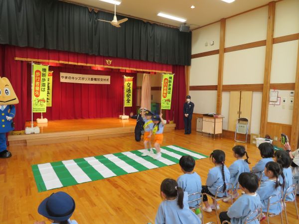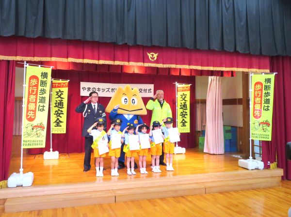 4月10日(金)、南砺市岩屋地内の市立山野保育園の年長園児6名を「やまのキッズポリス」に委嘱しました。委嘱状は南砺警察署長と南砺市交通安全協会長連名で中越安臣署長から交付され、岩﨑修会長は反射材を贈呈しました。園児は「ぼくたち、わたしたちは手をあげて横断歩道をわたります」と声をそろえて誓いの言葉を宣誓した後、高森地域交通課長代理から横断歩道の渡り方を学びました。キッズポリスは、今後の交通安全イベントに参加し交通事故防止を呼びかけます。