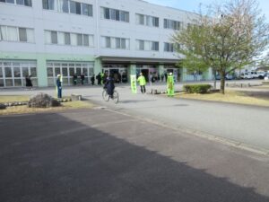 4月13日、魚津西部中学校において、中学校生活委員の生徒12名が、交通指導員や交通センター役員と共に、登校する中学生に自転車の安全利用を呼び掛けました。