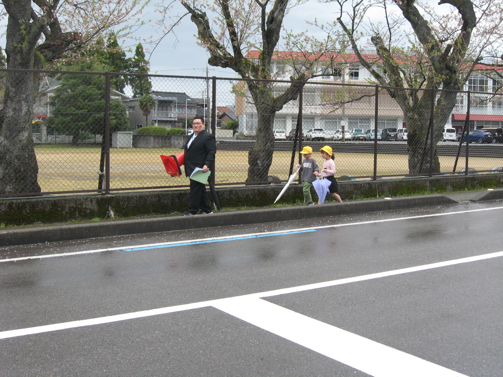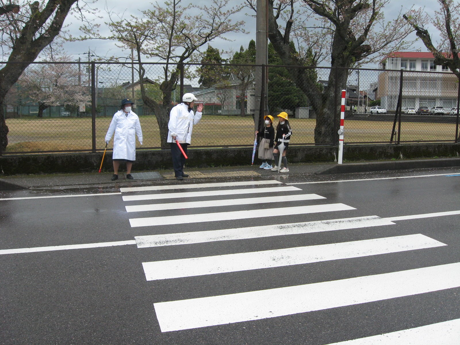 4月10日(金)午前9時15分から、富山市上滝地内の富山市立上滝小学校において、新一年生を対象とした交通安全教室が行われました。同交通安全教室には、新一、二年生18名のほか、富山南警察署大山交番員、交通指導員等が参加し、初めに大山交番の警察官から道路の安全な渡り方についてお話を聞いた後、小学校周辺の通学路を実際に歩行して、横断歩道の安全な渡り方等を実習しました。小雨の降る肌寒い天候でしたが、みんな元気に参加しました。