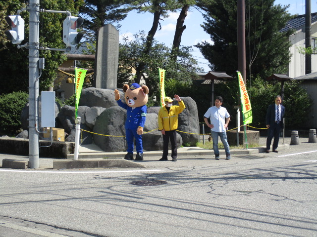 4月11日(土)午前10時から、富山市上袋地内の上袋神明社において、富山南交通安全協会蜷川地域支部が企画した交通安全祈願祭が行われました。同祈願祭には、富山南警察署員、蜷川地域支部役員のほか、交通指導員等交通安全関係団体が参加し、地域の交通事故防止を祈願しました。また、祈願祭終了後には、神明社前県道上において交通安全キャンペーンが実施されました。富山南交通指導員連絡協議会のマスコット「くまちゃん」も参加して、通行車両の運転手さんにチラシや交通安全グッズを配付して、春の全国交通安全運動の広報と交通事故防止を呼びかけました。