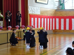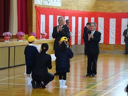 当協会(会長:坂井敏政)は、毎年、射水市と合同で、射水市内の小学校新1年生全員に交通安全帽子を贈呈しており、4月9日(木)、射水市立中太閤山小学校の新入生を代表として、入学式に併せて贈呈式を実施しました。
