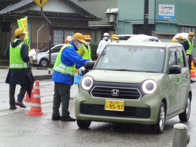 4月10日(金)の「絶対にしない!させない!飲酒運転根絶の日」「交通事故死ゼロを目指す日」の活動重点日にあわせ、小矢部市交通安全協会埴生支部(支部長 南 淳一)とおやべ女性ドライバー友の会(会長 嶋田 幸恵)は、県道小矢部・福光線において交通安全のチラシや‟カロリーゼロの缶コーヒー”を通過するドライバーに配布し、交通事故ゼロや飲酒運転ゼロを呼びかけました。