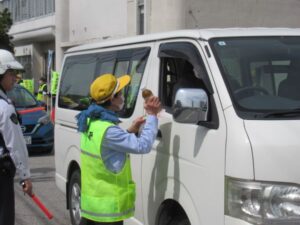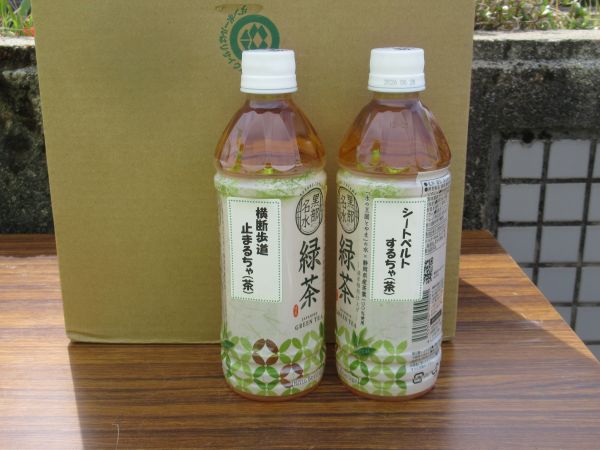 4月13日(月)午前10時から、入善警察署前において、黒東交通安全協会や交通安全関係団体約30名が集まり、シートベルト着用徹底の日に合わせて、「シートベルトするチャ(茶)」さらに「横断歩道止まるチャ(茶)」のシールを貼った管内協力企業より提供を受けたお茶のペットボトルと春の全国交通安全運動のチラシを、入善警察署まえを通過する一般ドライバー等に配布し、シートベルト着用と横断歩道での歩行者優先を呼びかけました。