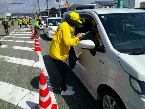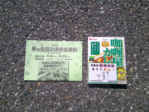 4月11日(土)、鵜坂公民館前道路において、鵜坂支部(支部長 澤村明)が交通安全キャンペーンを実施。チラシ及び啓発品「交差点見ていカレー」のメッセージを記したカレーを配布し、ドライバーに前後左右の安全確認の徹底等を呼びかけました。