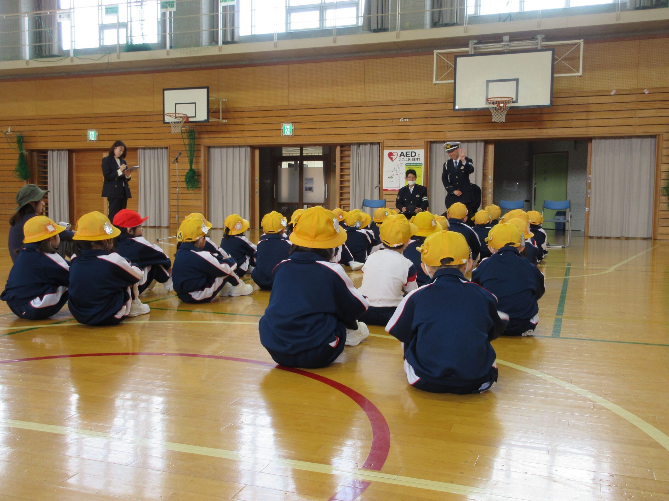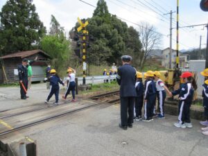 体育館で交通指導を受ける児童 踏切を渡る児童