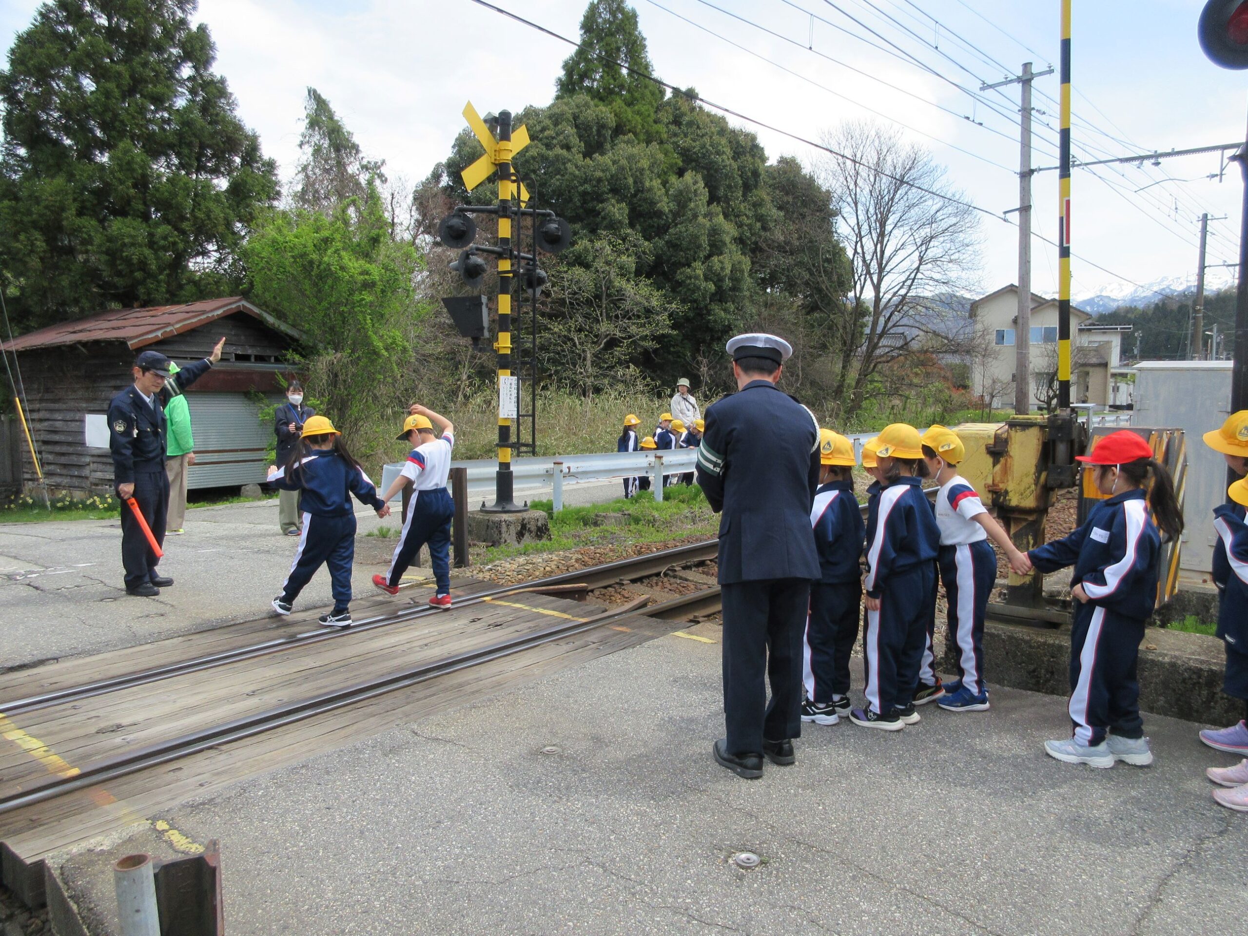4月13日(月)、宇奈月小学校の1・2年生32人を対象に、地域交通署員から交通安全指導の後、通学時における交通指導及び実際の通学路での横断歩道、信号機、踏切を渡る実技を実施し、終了後にはお巡りさんから講評がありました。