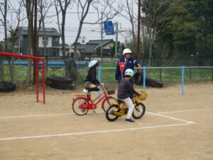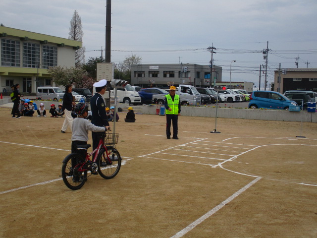 4月15日(水)午前9時30分から、富山市宮保地内の富山市立熊野小学校において、新三年生を対象とした交通安全自転車教室が行われました。同教室には、新三年生48人のほか富山南警察署員、富山南交通安全協会熊野地域支部役員、交通指導員、交通安全アドバイザー、富山市危機管理課員等が参加し、初めに富山南警察署交通課の高橋係長さんから交通事故防止のお話を聞いた後、座学と自転車実習の二班に分かれ開始しました。自転車実習の班は、校庭に設けられた模擬コースを使用して、繰り返し自転車の安全な乗り方を勉強しました。時折小雨の降る天候でしたが、子供たちは元気に参加しました。