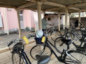 ポケットティッシュを配布する高校生等 自転車を点検する自転車商組合のみなさん