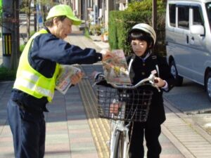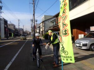 4月14日(火)小矢部市交通安全協会石動1支部(支部長 朱亀 孝)は、石動中学校付近において、自転車通学をする生徒らに交通安全チラシ・交通安全グッズを配布し、生徒らに自転車の安全利用を呼びかけました。