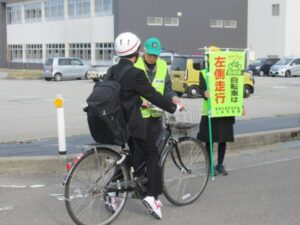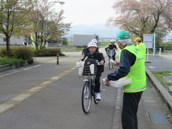 自転車安全利用の日である4月15日(水)午前7時20分から、黒東交通安全協会自転車安全利用推進隊9名と入善警察署交通課長以下3名が、朝日中学校自転車置き場等において、登校してきた自転車通学等の生徒に、自転車の交通違反防止等を記載したポケットティッシュを配布して、自転車運転時の交通ルールの厳守を呼びかけました。