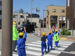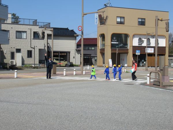 4月16日(木)午前9時30分から、入善町の入善小学校1年生(24人)と2年生(32名)を対象に交通安全教室を開催しました。入善警察署の地域交通課長から、信号機の説明や横断歩道での道路の横断の仕方についての説明を受けた後、1・2年生混合で班を組み、校外に出て実際の信号交差点を渡る練習をしました。信号交差点等では、入善警察署の警察官や黒東交通安全協会の入善支部役員や事務局職員らが、児童が安全に渡れるように補助や、渡り方の指導をしました。