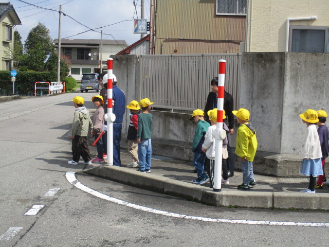 4月16日(木)午前9時30分から、富山市善名地内の富山市立大庄小学校において、新一年生を対象とした交通安全歩行教室が行われました。同教室には新一年生23名のほか、富山南警察署員、富山南交通安全協会大庄地域支部役員、交通指導員等が参加し、初めに富山南警察署大山交番の床鍋主任から、交通事故防止のお話を聞いた後、小学校周辺の通学路を実際に歩行して、道路の安全な歩き方や横断歩道の安全な渡り方を実習しました。子供たちは二人一組で手を繋ぎ元気に参加しました。