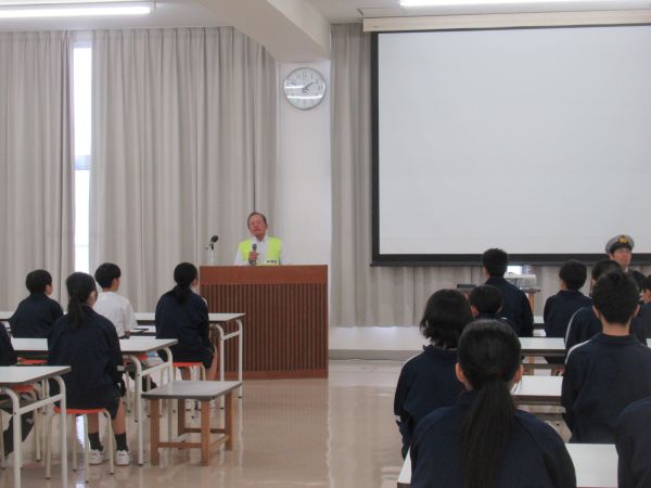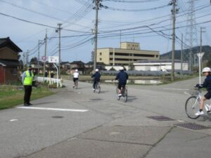 4月17日午後1時30分から、朝日町立朝日中学校1年生65人を対象に自転車の交通安全教室を開催しました。最初に黒東交通安全協会自転車安全利用推進隊代表の大林さんから、自転車運転の交通ルールとマナーを守ることが、自分自身の身を守る、周りの人に迷惑をかけないためにも大事なことであると、自転車運転も社会のルールであることを心に刻むようにしてほしいと講習しました。その後、自転車の交通安全DVDを視聴した後、全員自転車で郊外のコースを回り、一時停止や安全確認方法について再確認していました。