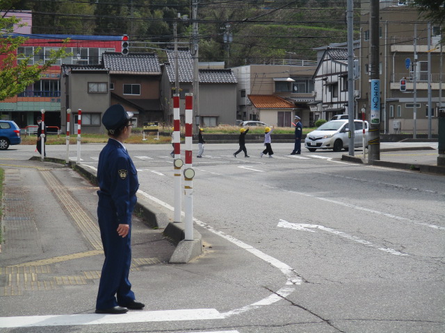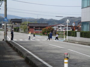 4月17日(金)午前9時15分から、富山市高内地内の富山市立大沢野小学校において、新一年生を対象とした交通安全歩行教室が行われました。同教室には、新一年生49名のほか、富山南警察署員、交通指導員等が参加し、初めに富山南警察署交通課の高橋係長さんから道路の安全な渡り方のお話を聞いた後、交通安全DVDを視聴しました。次に、小学校周辺の通学路を実際に歩行して、安全な歩き方や横断の仕方を実習しました。子供たちは、教わった「止まる、見る、待つ」をよく守り安全に歩行しました。