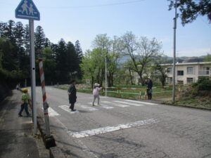 4月20日(月)午前9時30分から、富山市東福沢地内の富山市立福沢小学校において、全校児童を対象に交通安全教室が行われました。同交通安全教室には、福沢小学校の全校児童17名のほか、富山南警察署員、交通指導員等が参加し、初めに富山南警察署交通課の高橋係長さんから交通事故防止のお話を聞いた後、小学校周辺の通学路を実際に歩行して、安全確認の仕方や安全な横断の仕方を実習しました。最後に教室に戻り、交通安全DVDの視聴と児童による交通安全宣言があり同教室を終了しました。富山南交通指導員連絡協議会のマスコット「くまちゃん」も参加し、児童の人気を集めていました。