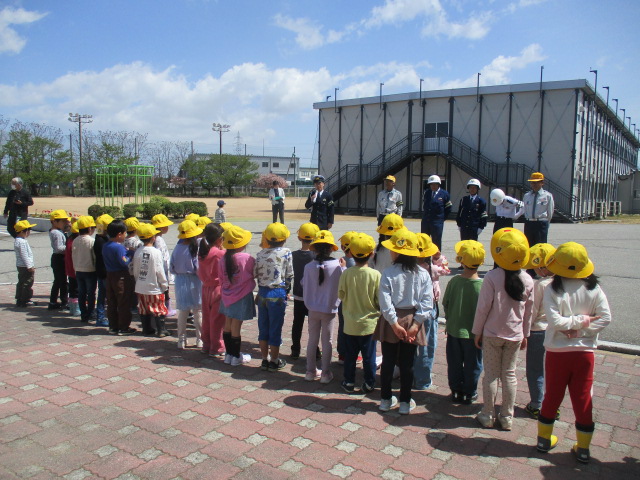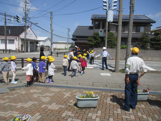 4月21日(火)午前10時30分から、富山市宮保地内の富山市立熊野小学校において、新一年生を対象とした交通安全歩行教室が行われました。同教室には、新一年生33名のほか、富山南警察署員、富山南交通安全協会熊野地域支部役員、交通指導員、交通安全アドバイザー等が参加し、初めに富山南警察署交通課の高橋係長さんから交通事故防止のお話を聞いた後、ダミー人形を使用した衝突実験と内輪差実験を見学し、交通事故の恐ろしさを体験しました。最後に小学校周辺の通学路を実際に歩行して、横断歩道の安全な渡り方や安全な歩行の仕方を勉強しました。早朝までの雨が嘘のような晴天の下、子供たちは元気に参加しました。