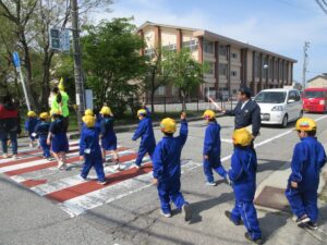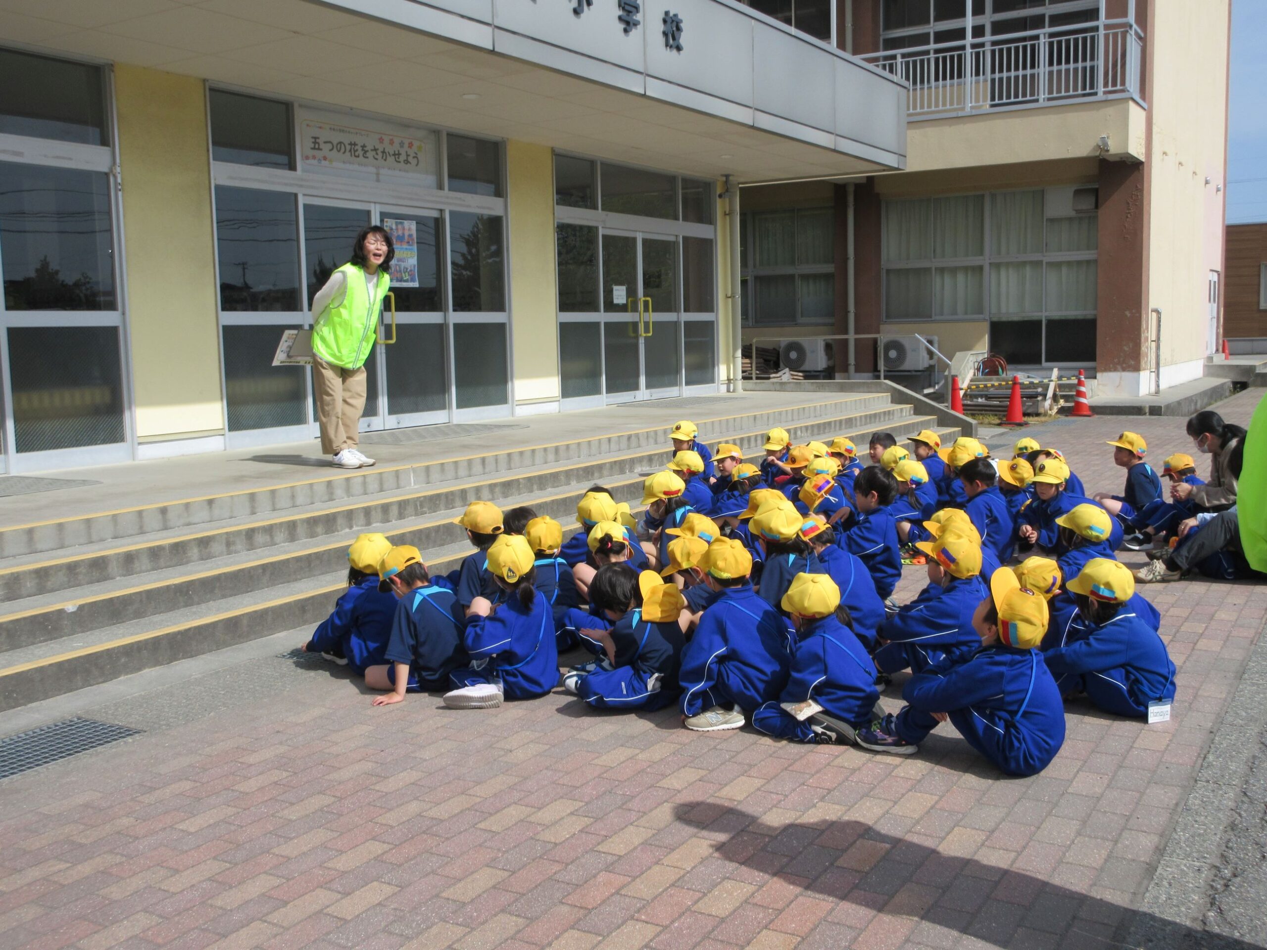 4月20日(月)、中央小学校の新1年生52人を対象に、駐在所員及び協会職員から学校周辺の通学路の安全な渡り方の指導を受けた後に、学校周辺の通学路において「安全な歩行、横断歩道の渡り方」等の実技指導が実施されました。帰校後には駐在所員から注意すべき点についての講評がありました。