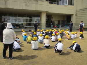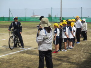 4月28日(火)午前9時から、富山市坂本地内の富山市立船峅小学校において、全校児童を対象とした交通安全教室が行われました。同教室には船峅小学校全校児童41名のほか、富山南警察署員、交通指導員、育友会役員等が参加し、初めに富山南警察署交通課の高橋係長さんから交通事故防止のお話を聞いた後、一二年生13名は、小学校周辺の通学路で歩行実習、三年生から六年生までの28名は、校庭に設置された模擬コースを使用して自転車実習を行いました。少し風の強い日でしたが晴天の下、子供たちは元気に参加しました。